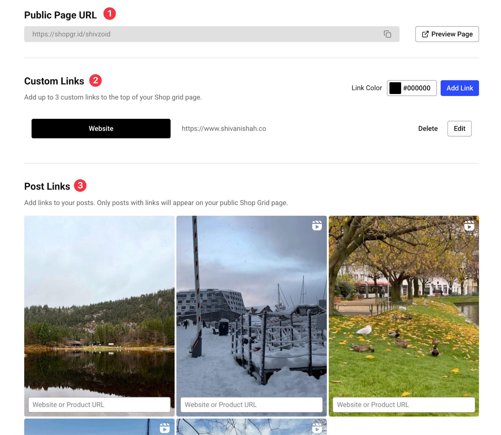 - The option to add up to three custom links to the top of your Instagram Grid page. You can use this space to share your website’s homepage, send people straight to a new collection, or spotlight your star product.