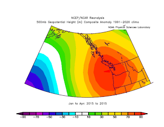 Di bawah ini adalah peta yang berbeda dari 500 hPa normal (pikirkan tekanannya 18.000 kaki). Untuk Januari hingga April 2015, merah menunjukkan tekanan lebih tinggi dari biasanya pada ketinggian ini. Tekanan tinggi seperti itu bekerja secara efektif untuk kering dan hangat, mengurangi curah hujan dan salju.