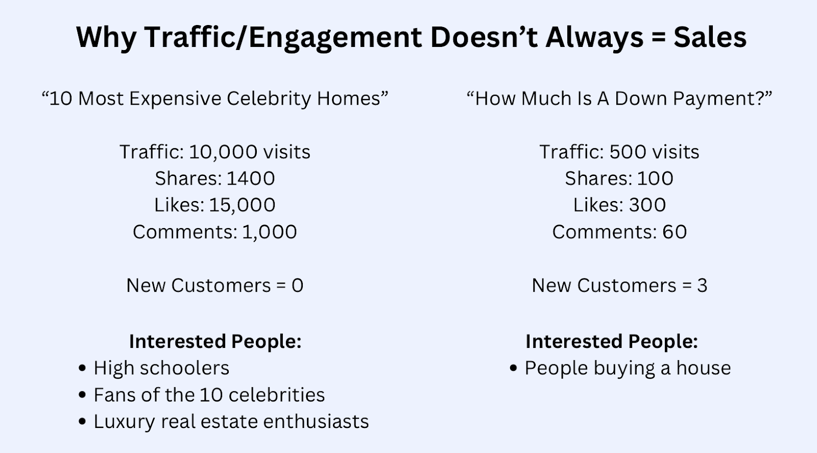A blog post about the most expensive celebrity homes will likely earn more traffic and engagement than a blog post about how to budget for a down payment. Yet the person researching down payments is in market and a great potential customer, whereas many of the people reading the celebrity home blog post might be high school students who will never buy from you.