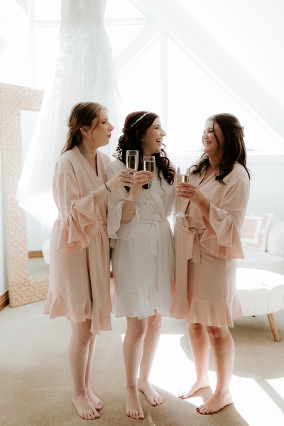 Elizabeth’s wedding party included her maid of honour, her twin sister, Cheryl and her bridesmaid, Crystal was her best friend. Cheryl and Crystal were both dressed in blush pink, cocktail length dresses with v necklines, and a cinched waistline with the dress flaring out at the end.