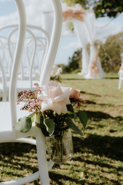 Brisbane City Celebrants set up a Hamptons styled four post arbour with white draping, decorated with soft pink dried flowers atop the arbour and in vases below, with candles beside them. The decorations for the ceremony were wonderfully done; everything worked well together to create a romantic atmosphere.