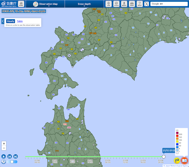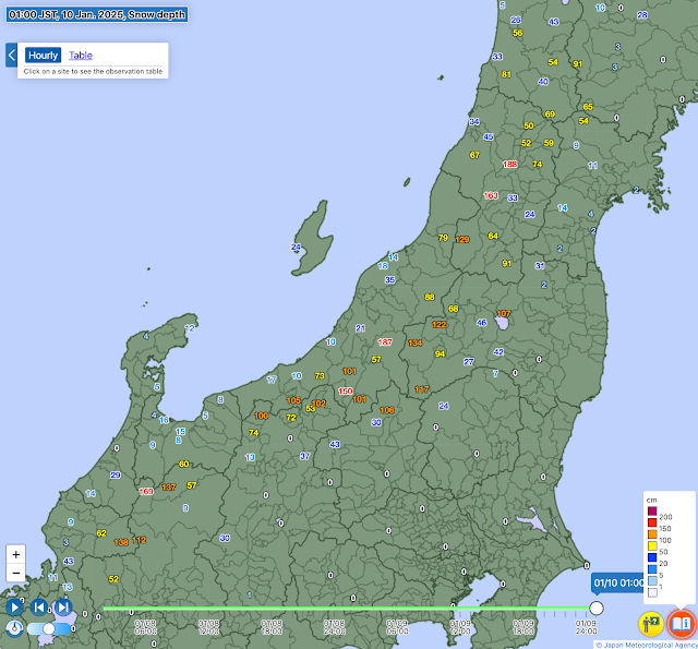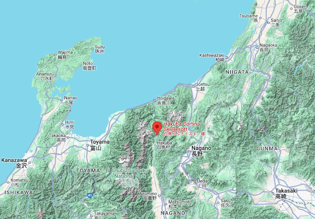 Pasalnya, Badan Meteorologi Jepang (JMA) tidak memiliki fasilitas observasi ketinggian di pusat Honshu. Jadi saya melihat laporan salju di resor ski Hakuba Cortina di Lembah Hakuba bagian utara. Dekat Laut Jepang (Lokasi pada peta di bawah). Kedalaman salju saat ini dilaporkan 340 cm/134 in. Peristiwa ini kemungkinan besar diamati dari ketinggian kurang dari 1.400 m/4.593 kaki karena lokasi resor di lereng bukit Hida