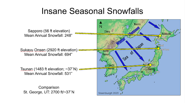 Melihat peta di atas untuk pusat Honshu. Menampilkan perubahan dramatis cuaca salju di seluruh Jepang. Di ketinggian rendah dekat pantai Kedalaman salju adalah