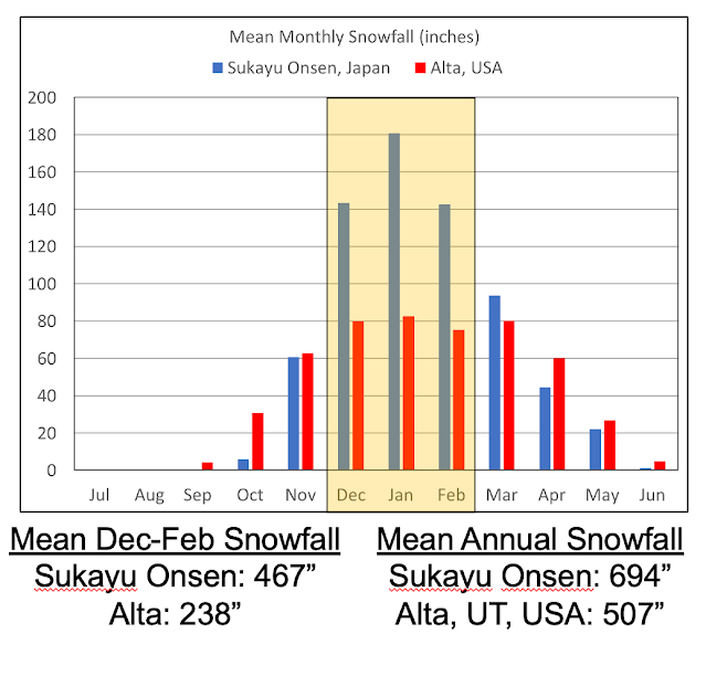 Suku Utahn sangat bangga dengan banyaknya salju yang turun di Little Cottonwood Valley, namun ada baiknya membandingkan jumlah salju dari Alta hingga Sukayu Onsen. Salju musiman tidak hanya lebih melimpah di Sukayu Onsen. Namun setelah memulainya secara perlahan Pada bulan Oktober dan November Salju juga datang lebih cepat. Hal ini terutama terjadi selama musim dingin di Asia Timur antara bulan Desember dan Februari. Pada dasarnya Iklimnya adalah periode tiga bulan dengan suhu rata-rata lebih dari 140 inci setiap bulannya, dan mencapai puncaknya pada 180 inci pada bulan Januari. Itu lebih dari dua kali lipat kota Alta.