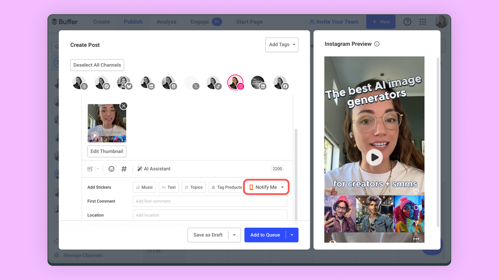 Pilih Instagram dari daftar saluran di bagian atas editor postingan. (Anda juga dapat menambahkan saluran lain yang telah Anda sambungkan untuk mem-posting silang konten Anda di tempat lain).