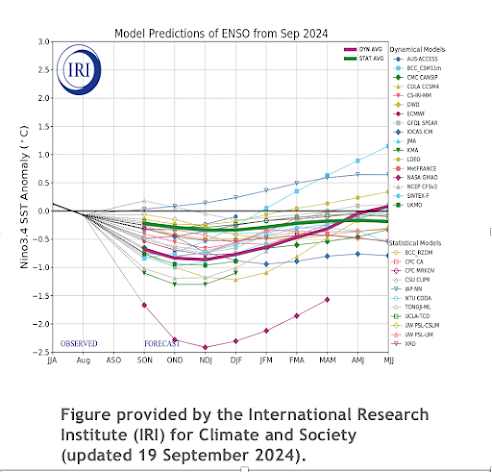 Di bawah ini adalah grafik yang menunjukkan serangkaian prediksi menggunakan metode berbeda. Agak statistik Beberapa menggunakan model fisik. Sebagian besar memperkirakan kondisi La Niña netral atau lemah. Ada kemungkinan besar terjadinya badai.