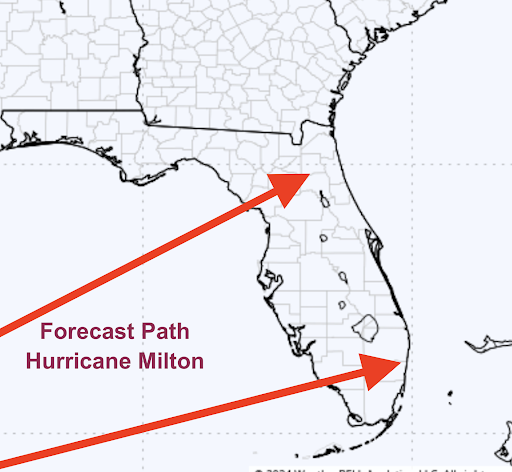 Kita menghadapi situasi yang tidak biasa dengan badai Cat 1 hingga Cat 3 yang diperkirakan akan menyerang pantai barat Florida di sepanjang atau di antara anak panah yang memprediksi jalur mata. Dampak badai akan melampaui area yang ditunjukkan oleh panah.