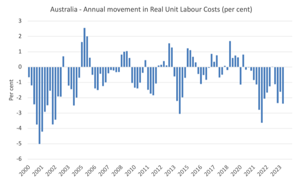 Even though productivity growth has been weak or negative recently, RULCs have continued to fall, because the real wage growth has been weaker than the productivity growth (or in the current period, the fall in real wages has outstripped the fall in productivity growth).