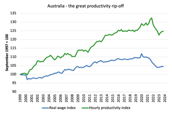 But, over the time shown, the real hourly wage index has grown by only 4.6 per cent (and falling sharply), while the hourly productivity index has grown by 24 per cent.