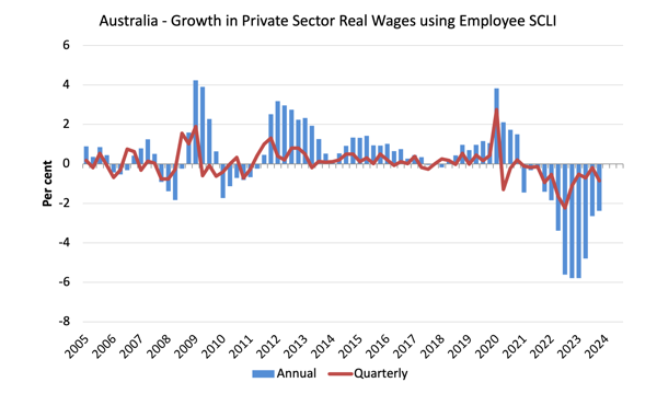 To further reinforce that point, the following graphs use the Employee SLCI measure (first graph) and the CPI (second graph) to show the movement of real wages in the private sector from 2005 to the March-quarter 2023.
