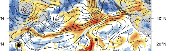 Ketiga, aliran atmosfer besar menggunakan uap yang tidak biasa di atas Cina dan bergerak melintasi Samudra Pasifik. (Oranye dan merah bernilai tinggi)