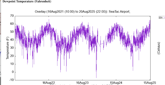 Di sini di Seattle Kami menemukan embun tertinggi (65 ° F) sejak Agustus 2022 (lihat plot di bawah ini.– Ini sangat “lengket” pada hari Jumat.