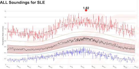 Di Salem, Oregon 1,82 inci, nilai tertinggi yang telah ditemukan di situs itu (lihat di bawah)– Di plot di bawah ini, garis merah menunjukkan catatan harian.