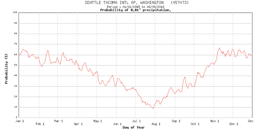 Probabilitas iklim hujan. 01 inci Seattle menunjukkan di bagian bawah 28 Juli, kami pergi ke bawah, dengan peluang kurang dari 10 % hujan dalam satu hari. Tetapi pada pertengahan Agustus, probabilitas meningkat menjadi 20% menjadi 30% per minggu.