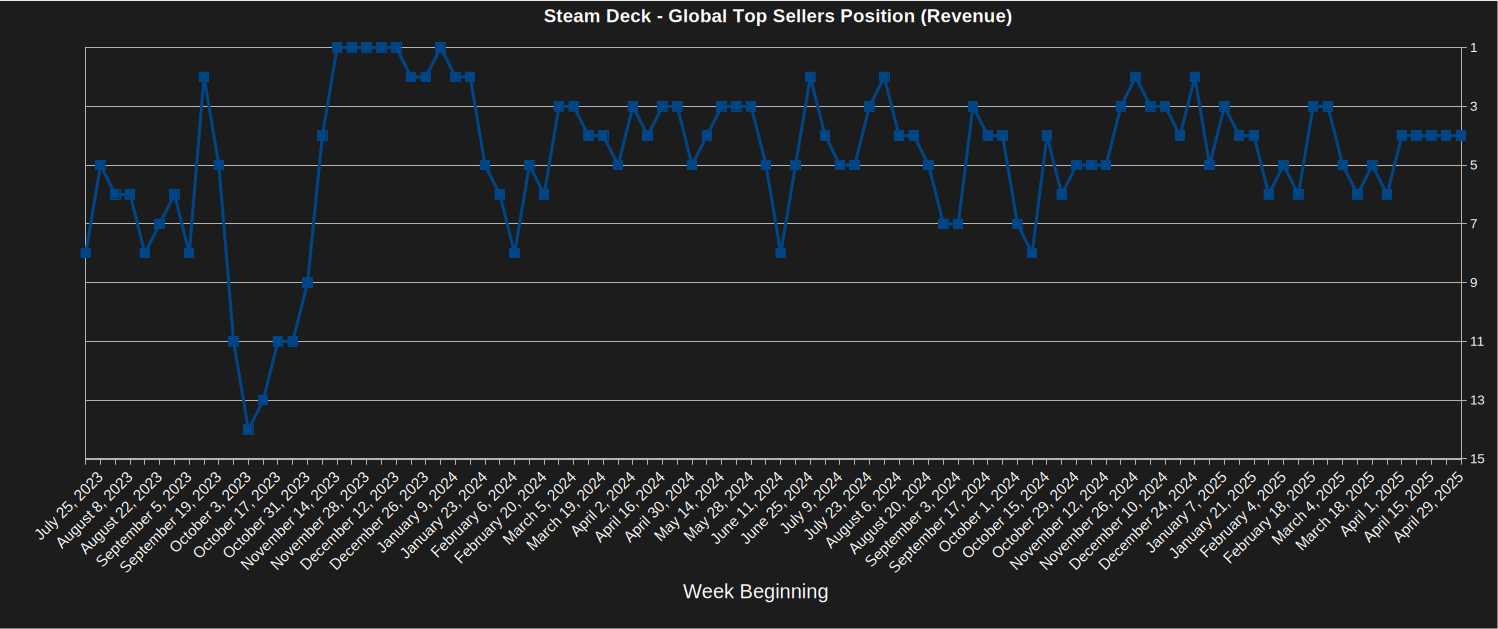 Ketika Anda melihat tahun lalu, posisi rata-rata lokasi dek uap adalah sekitar 4, yang merupakan kabar baik untuk kesehatan jangka panjang platform. Kami secara bertahap melihat lebih banyak dan rilis game yang lebih besar, yaitu Steam Deck tidak dapat menanganinya sama sekali, jadi akan menarik untuk melihat bagaimana penjualan berubah dalam 1-2 tahun ke depan. Meskipun, ketika Anda melihat paling banyak game pada bulan April 2025, itu menunjukkan bahwa ada beberapa game menarik yang dicampur bersama.