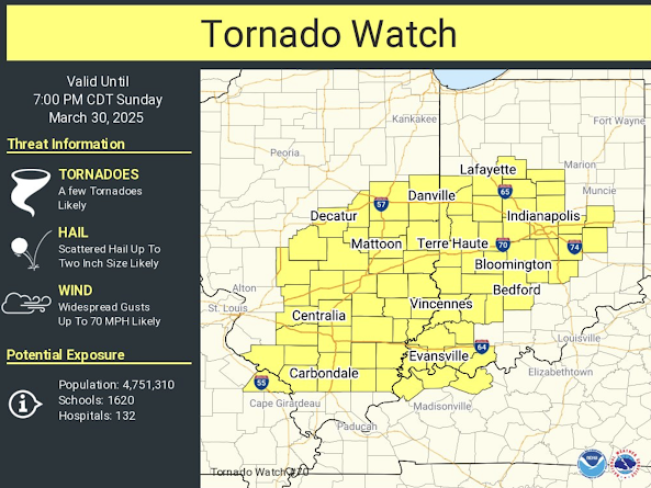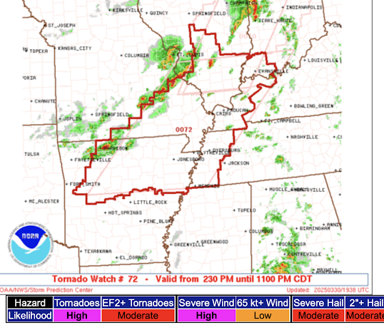Ini adalah jam tornado pertama hari ini. Harap dicatat bahwa ada prediksi hembusan kuat 2 “dan 70 mil per jam.