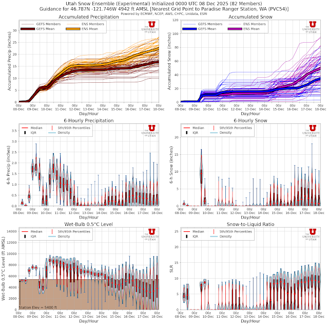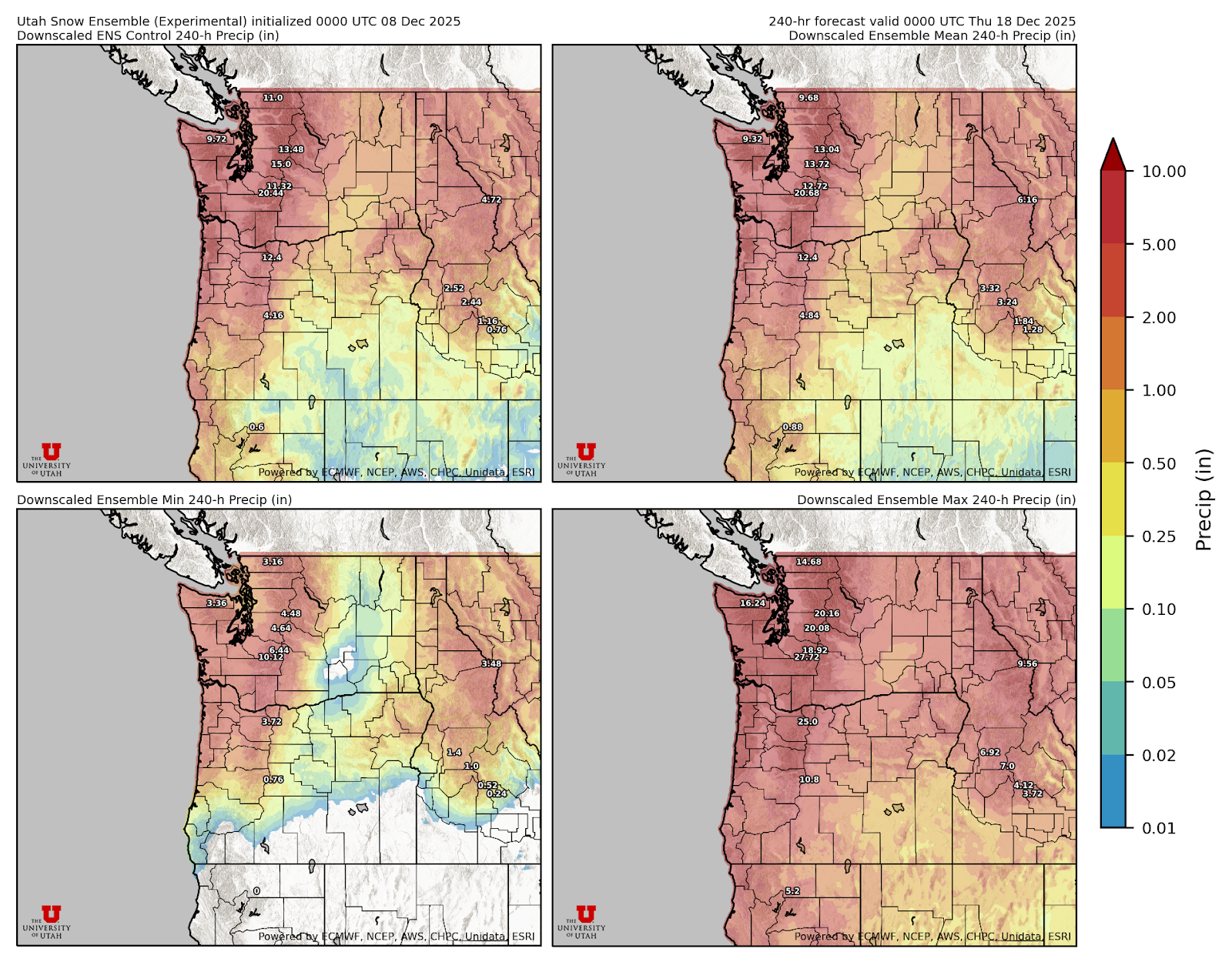 Saya sebutkan di postingan sebelumnya bahwa jalur badai akan mencapai utara kita dalam beberapa hari ke depan. Memang benar, wilayah barat laut Pasifik menghadapi banjir karena dilanda berbagai sistem badai. Di bawah ini adalah prakiraan Ensemble Salju Utah untuk periode 10 hari yang berakhir pukul 00.00 UTC tanggal 18 Desember. Curah hujan cair rata-rata ansambel (kanan atas) setara dengan 9″ untuk sebagian besar air terjun dari Gunung Hood ke Kanada.